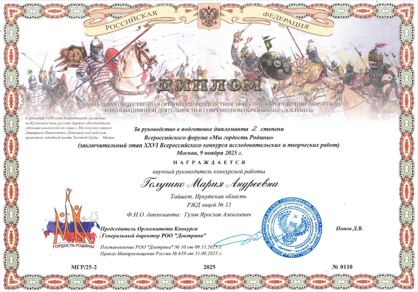 | Диплом за руководство в подготовке дипломанта 2 степени Всероссийского форума "Мы гордость Родины" (заключительный этап XXVI Всероссийского конкурса исследовательских и творческих работ)