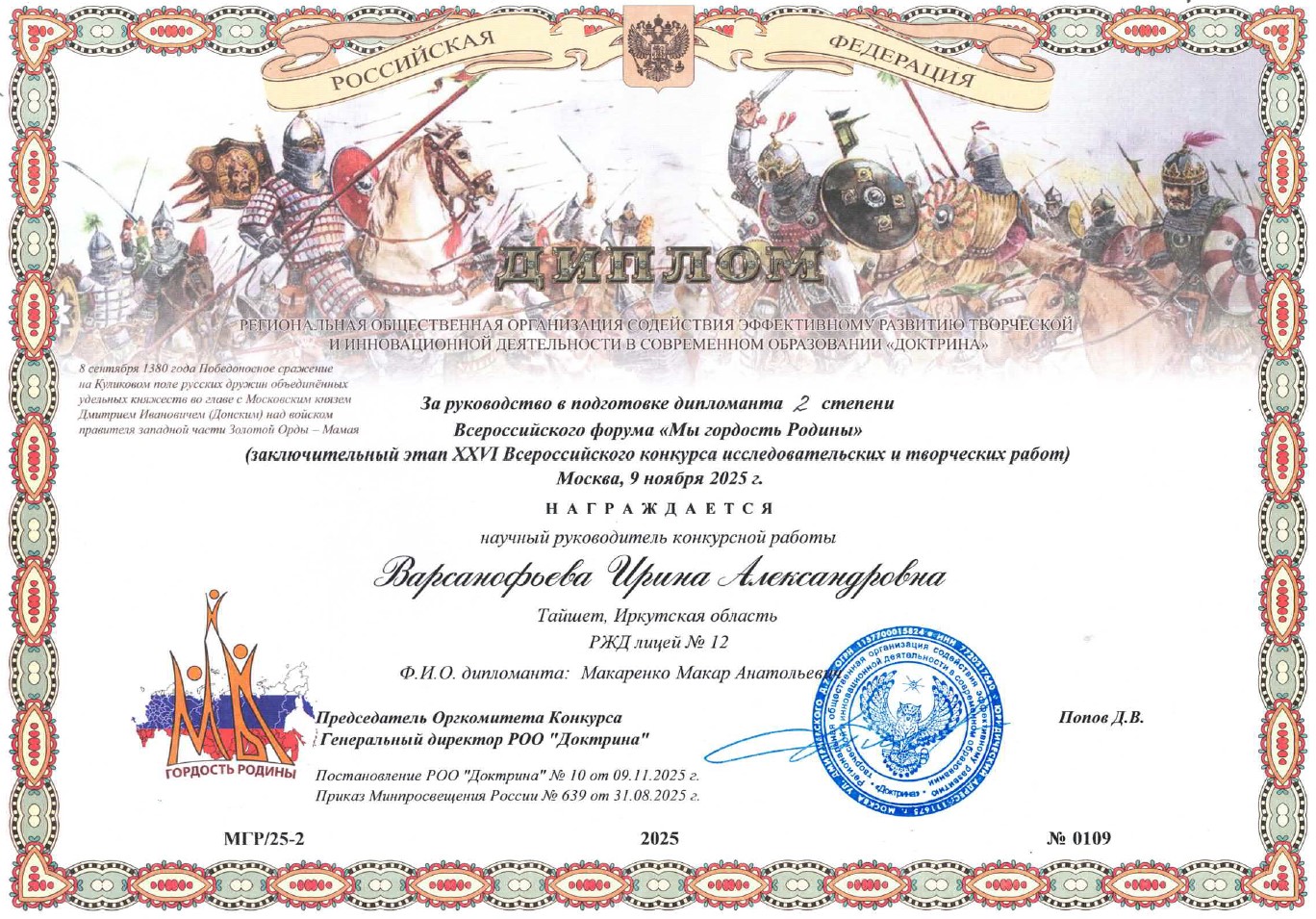 Диплом за руководство в подготовке дипломанта 2 степени Всероссийского форума "Мы гордость Родины" (заключительный этап XXVI Всероссийского конкурса исследовательских и творческих работ)