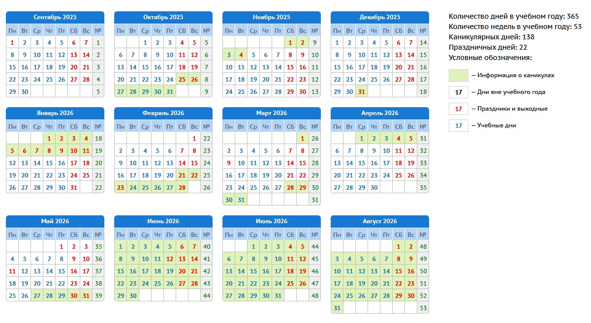 График учебного и каникулярного времени на 2025-2026 учебный год