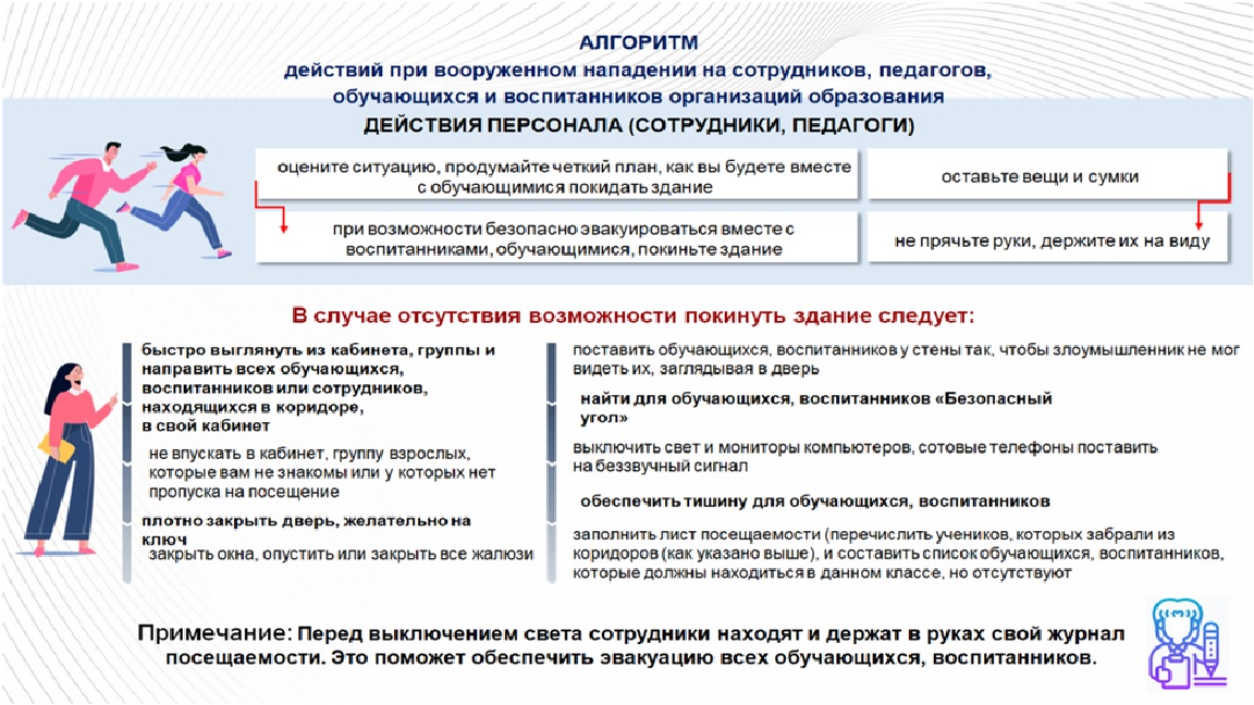Алгоритмы действий персонала и обучающихся, работников частных охранных организаций при совершении (угрозе совершения) преступления в формах вооруженного нападения, размещения взрывного устройства, захвата заложников, а также информационного взаимодействия образовательных организаций с территориальными органами МВД, Росгвардии и ФСБАлгоритм действий руководителей и работников РЖД лицея № 12 при вооруженном нападении